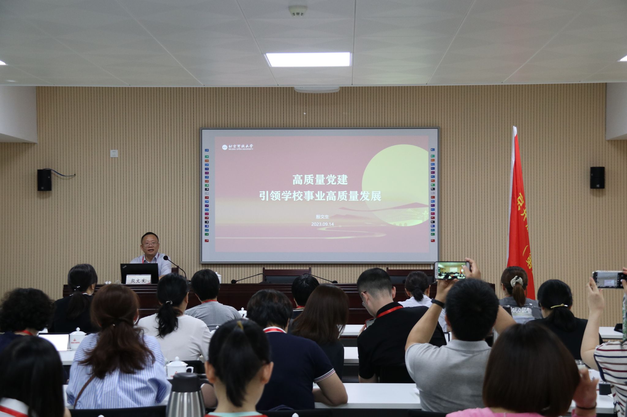 三位参训校领导结合学校转型发展需要和党员、教职工队伍建设实际,分别为学员作专题辅导讲座。党委副书记殷文生以“高质量党建引领学校事业高质量发展”为题,系统全面梳理了党的建设有关要求,深入浅出讲解了如何结合学校实际高质量抓好党建工作,引导党组织和党员在工作实践中充分发挥战斗堡垒和先锋模范作用。副校长李继延以“坚守初心、智创未来—从战略视角看职业发展与个人成长”为题,引导党员、教师热爱开放教育事业,立足本职岗位提升业务能力、主动担当作为,加强沟通交流,持续增强团队和学校凝聚力,在投身教育教学实践中成长成才。纪委书记周启柏以“做一名优秀的开放教育工作者”为题,结合红旗渠精神和学校实际交流工作体会,从“认清状态、修炼心态、营造生态、奋斗姿态”四个方面,引导学员找准个人定位、拓展思维方式、严格自我要求、提升能力素质,将个人成长融入学校事业发展大局。
