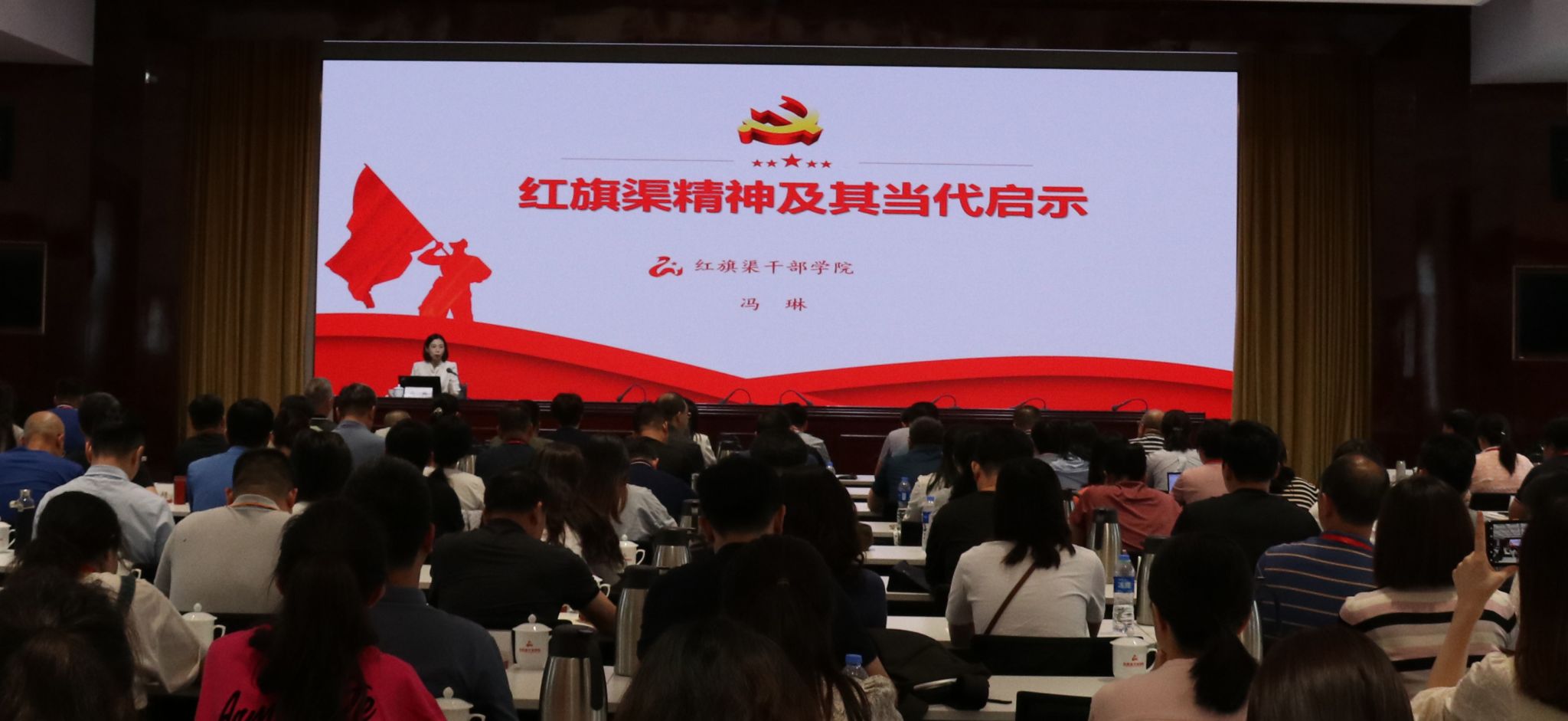 红旗渠干部学院培训部副主任冯琳围绕《红旗渠精神及其当代启示》作专题报告,结合习近平总书记在红旗渠考察时的重要讲话精神,列举大量数据和感人事例,从红旗渠概况、修建过程以及红旗渠精神内涵和启示三个方面,生动形象地讲述了修渠历史和“解放思想、实事求是、守正创新”的时代启示。