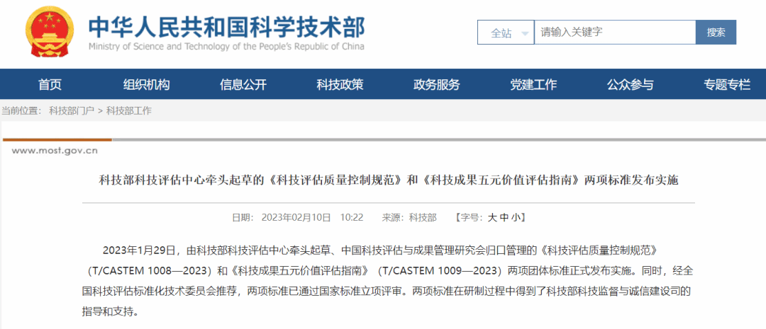 2023年1月29日,由科技部科技评估中心牵头起草、中国科技评估与成果管理研究会归口管理的《科技评估质量控制规范》(T/CASTEM 1008—2023)和《科技成果五元价值评估指南》(T/CASTEM 1009—2023)两项团体标准正式发布实施。同时,经全国科技评估标准化技术委员会推荐,两项标准已通过国家标准立项评审。两项标准在研制过程中得到了科技部科技监督与诚信建设司的指导和支持。